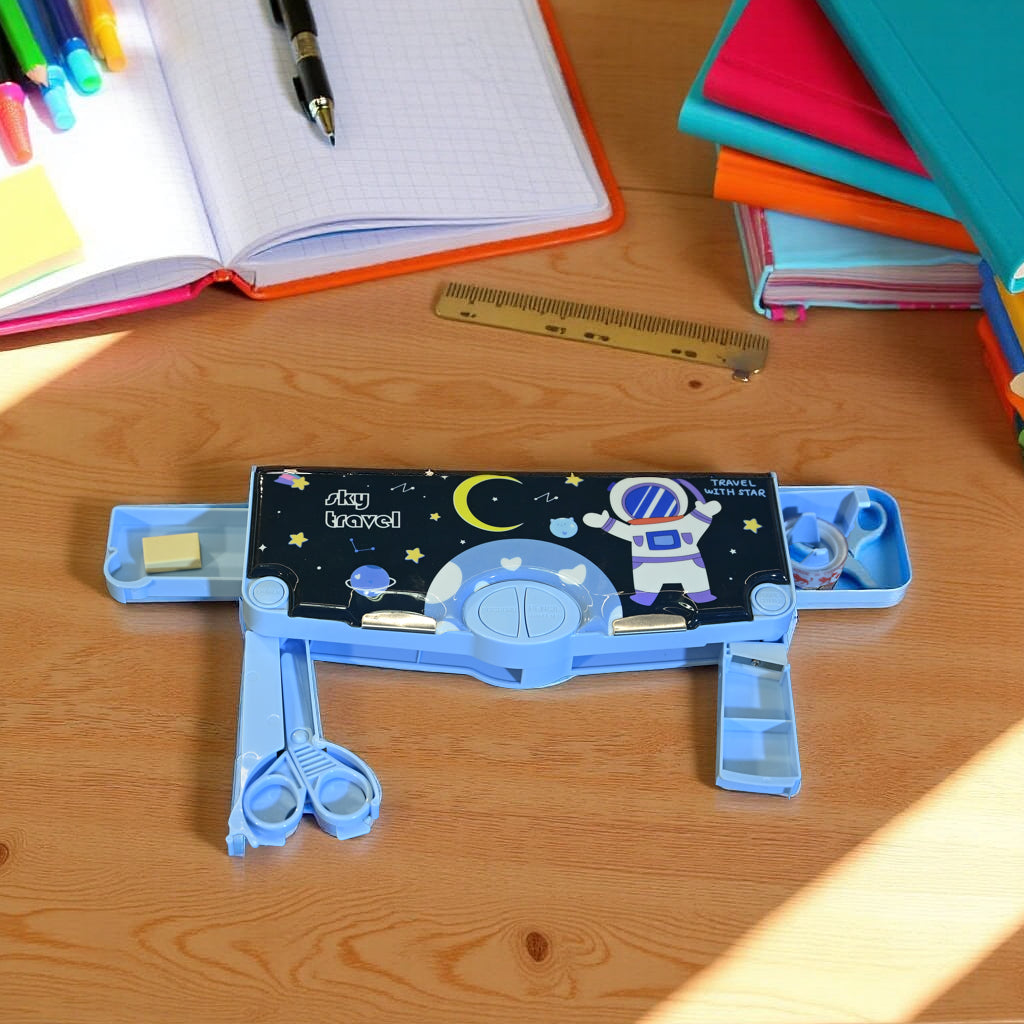 Get ready to explore the galaxy of learning with the StarVoyager Box! Featuring a playful astronaut, stars, and planets on a sleek night-sky background, this pencil box turns everyday study time into a space mission. Built with smart compartments and a durable body, it's perfect for little explorers!